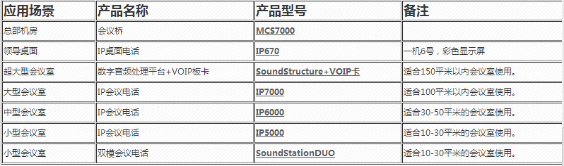 在总部部署一套IP电话会议桥,实现总部和各分部的会议终端的呼入与呼出,召开多方电话会议。在总部与各分部会议室,按照会议室的大小不同,部署不同型号高清IP会议终端。